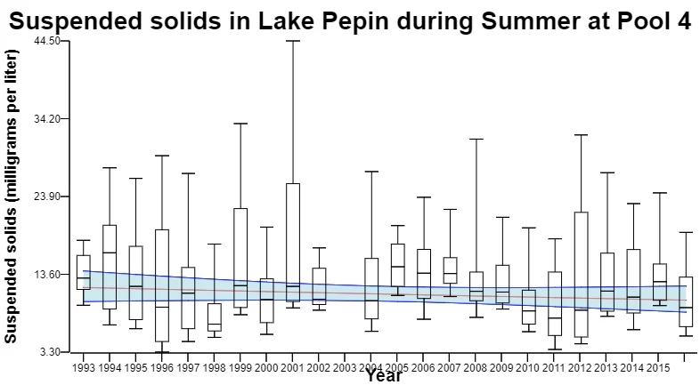 Based on the USGS Upper Mississippi River Restoration Program’s Long Term Resource Monitoring (LTRM), the total suspended solids (TSS) and total phosphorus (TP) in Lake Pepin during the summer has been relatively constant since 1993 (Figure 2, Figure 3).